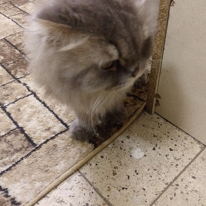 - "A fluffy, gray Persian cat stands near the edge of a rectangular patterned rug and a plain, light-colored doorframe" by FM-o4pOG2, licensed under CC BY 4.0