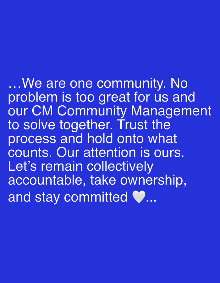 The image displays white text against a solid blue background. No specific physical location in Ado, Nigeria, is depicted or identifiable. The text, centered on the blue field, reads: "...We are one community. No problem is too great for us and our CM Community Management to solve together. Trust the process and hold onto what counts. Our attention is ours. Let's remain collectively accountable, take ownership, and stay committed ❤️...". No individuals, actions, or physical objects other than the textual elements and background color are present. The only symbol beyond alphanumeric characters is a white heart emoji at the end of the message.
