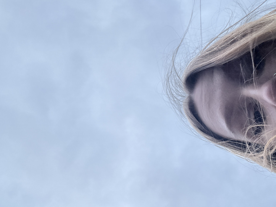 The image displays a low-angle, upward-facing perspective of a female's upper head against an overcast sky, originating from Krasnodar, Russia. The subject's light-colored hair is visibly windswept, with individual strands extending upwards and to the right. Her forehead shows minor creases, and her eyes are partially visible, directed downwards. A metallic ring piercing is present in her left nostril. The background consists entirely of a uniformly light blue-grey sky with diffuse cloud formations, indicating an outdoor, daytime environment with atmospheric movement affecting the subject's hair. No other individuals or objects are discernible within the frame.