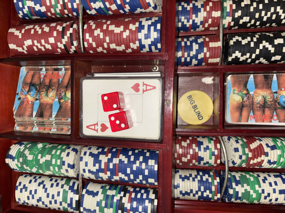 - "The image displays a poker chip set organized within a dark red, compartmentalized wooden box" by FM-YEyMx1, licensed under CC BY 4.0