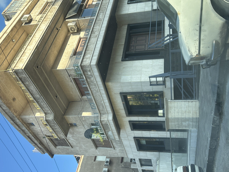 The image displays a multi-story building located in the Al-Muhajerin Municipality, Syria, under a clear blue sky. The upper floors feature a weathered, light beige concrete or stucco facade with multiple cantilevered balconies. These balconies are equipped with dark gray metal railings, some incorporating gold-colored decorative inserts. Dark brown roll-down shutters are present on most windows on the upper levels. Two white exterior air conditioning condenser units are mounted on the right side of the building's facade. The lower two visible floors are clad in light beige rectangular stone tiles, framing large, dark-trimmed windows that reflect the surroundings. The main entrance, located on the right side of the ground floor, consists of double dark brown wooden doors, recessed and accessed via a set of dark gray metal stairs with a matching railing. A light-colored stone pedestal, featuring an attached exterior light fixture, stands on the sidewalk. Adjacent to this, a dark gray metal gate system secures access to a recessed area below street level. In the immediate foreground on the right, a partially visible older model sedan, light in color (possibly white or very pale gray), shows significant paint deterioration and damage to its front bumper area. A portion of a white vehicle is visible on the far left. The scene is illuminated by direct sunlight, casting distinct shadows. No individuals are visible.