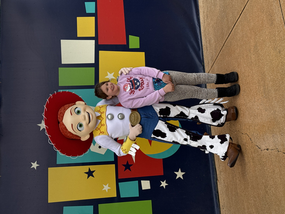 The image displays two subjects posing for a photograph in front of a colorful backdrop in Chessy, France. On the left, a performer in a full-body costume portrays Jessie, the cowgirl character from Disney/Pixar's Toy Story. The costume includes a large red cowboy hat with white stitching, red braided hair, a white long-sleeved shirt with yellow details and three prominent silver buttons, a gold-colored belt buckle, blue pants, and white chaps with irregular black cow print, culminating in brown cowboy boots. The character's face exhibits large green eyes and a wide, open-mouthed smile. Its right arm is extended around the shoulder of the adjacent child. On the right stands a female child, appearing approximately 8-12 years old, with brown hair. She wears a light pink long-sleeved sweatshirt featuring a graphic design and a red circular pin on the left chest area, leopard-print leggings, and black UGG-style boots. She holds a small, blue-patterned object with both hands at waist level. The child smiles broadly, looking directly at the camera, with her right arm positioned around the waist of the costumed character. The background is a dark blue wall or partition adorned with assorted rectangular blocks in yellow, green, white, red, and light blue. Several white and black star decals are scattered across this backdrop. The ground surface is a light brown, possibly concrete or paved, material with a discernible crack running horizontally beneath the subjects.