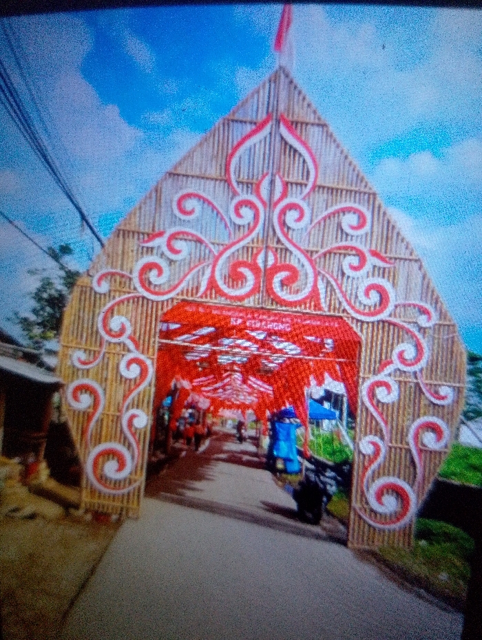 The image depicts an outdoor scene in Ciherang, Indonesia, featuring a large, ornate gateway. The gateway, positioned centrally, is constructed primarily from vertical bamboo poles, forming an A-frame shape with a rectangular archway opening. Decorative red and white stylized scroll patterns are prominently applied to the bamboo structure, predominantly on the upper triangular portion and along the vertical sides of the archway. A small red and white flag, consistent with the flag of Indonesia, is affixed to the apex of the gateway. Beyond the archway, a paved pathway or road extends into the distance, covered overhead by extensive red fabric or banners, creating a tunnel-like canopy. White strings or lights are visible suspended within this red overhead decoration. Several indistinct human figures are visible on the pathway under the canopy, walking or standing. A two-wheeled vehicle, possibly a motorcycle or scooter, with a large blue covered object attached, is parked or moving slowly on the right side of the pathway beyond the arch. To the immediate left of the gateway, a simple, single-story building or structure with an open entrance is partially visible. The ground immediately adjacent to this structure appears unpaved. Utility lines are discernible against the blue sky in the upper left quadrant. The sky above the gateway is clear blue with sparse white clouds, indicating daylight conditions. Green foliage is visible on the ground to the immediate right of the gateway structure.