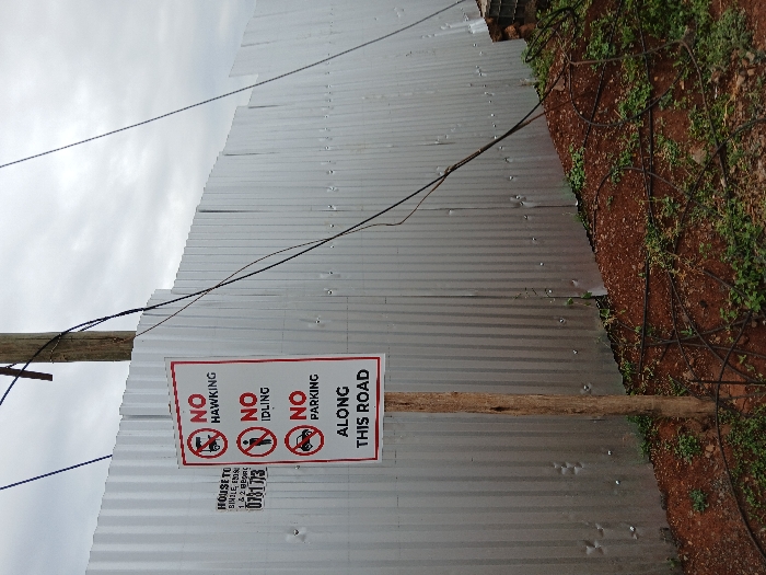 The image depicts an outdoor scene in Witeithie ward, Kenya, dominated by a tall, weathered corrugated galvanized iron fence extending horizontally across the midground under an overcast sky. In the foreground, reddish-brown soil covers the ground, interspersed with sparse green vegetation and several black electrical or communication cables lying loosely. A rough, light brown wooden pole, approximately one meter high, stands embedded in the soil, supporting a rectangular white sign with a red border. The sign displays three circular red "NO" prohibition symbols: the top depicts a handcart with "NO HAWKING" text, the middle a standing person with "NO IDLING" text, and the bottom a car with "NO PARKING" text. Below these, the phrase "ALONG THIS ROAD" is written in larger red letters. To the left of this sign, a smaller, partially obscured white sign or sticker is affixed to the corrugated fence, displaying "HOUSE TO LET," "SINGLE, EN-SUIT," and a partial phone number "0791773." A dark wooden utility pole is partially visible in the upper center, with several black wires extending downwards. No people or active interactions are visible in the scene.
