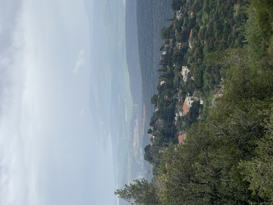 An elevated landscape photograph captures a hillside settlement situated within what appears to be the Merom HaGalil Regional Council, Israel, under a uniformly overcast sky. The immediate foreground is dominated by dense, leafy green foliage and tree branches, with a prominent conifer visible on the left. In the midground, a residential community is spread across a verdant slope, comprising multiple detached houses with light-colored facades and distinct reddish-orange tiled roofs, interspersed among a dense arrangement of green trees and shrubs. Overhead power lines are visible, horizontally traversing the settlement. Beyond the developed area, a wide valley or plain extends, revealing a winding road, cultivated green fields, and patches of reddish-brown earth. In the distant background, a large body of water, possibly a lake or sea, is discernible with a curved shoreline and faint indications of coastal development, backed by hazy mountain ranges. No individuals, specific actions, or interactions are visible.