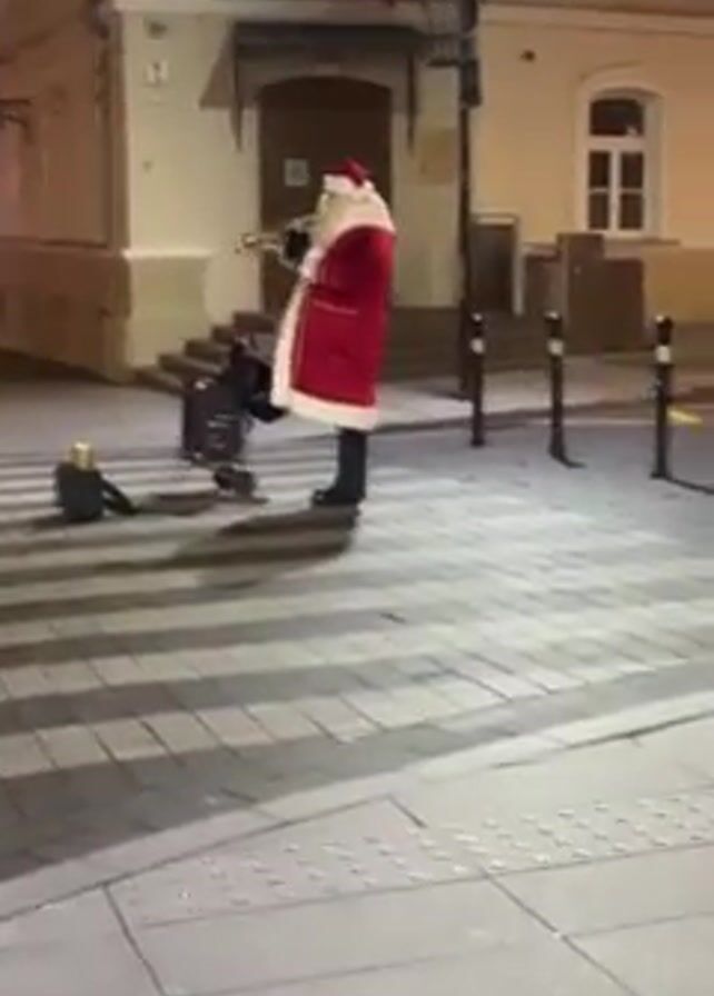 A figure dressed as Santa Claus stands on a sidewalk, playing a trumpet