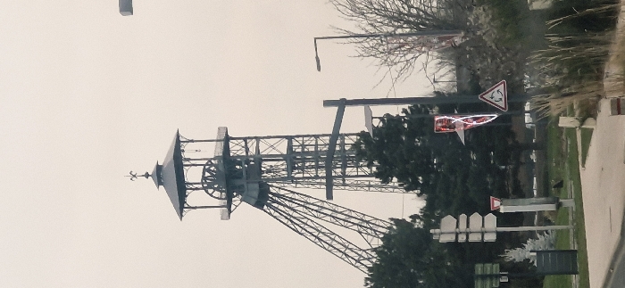 The image displays the Puits Saint-Amé mine headframe located in Liévin, France, viewed under an overcast sky