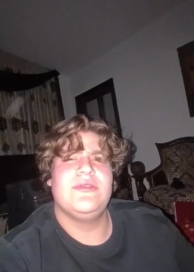 A person with curly blonde hair sits facing the camera. The person wears a black shirt. The background includes dark curtains, a door, a painting, and a chair. The person raises their hand, and the index, middle, and ring fingers are extended.
