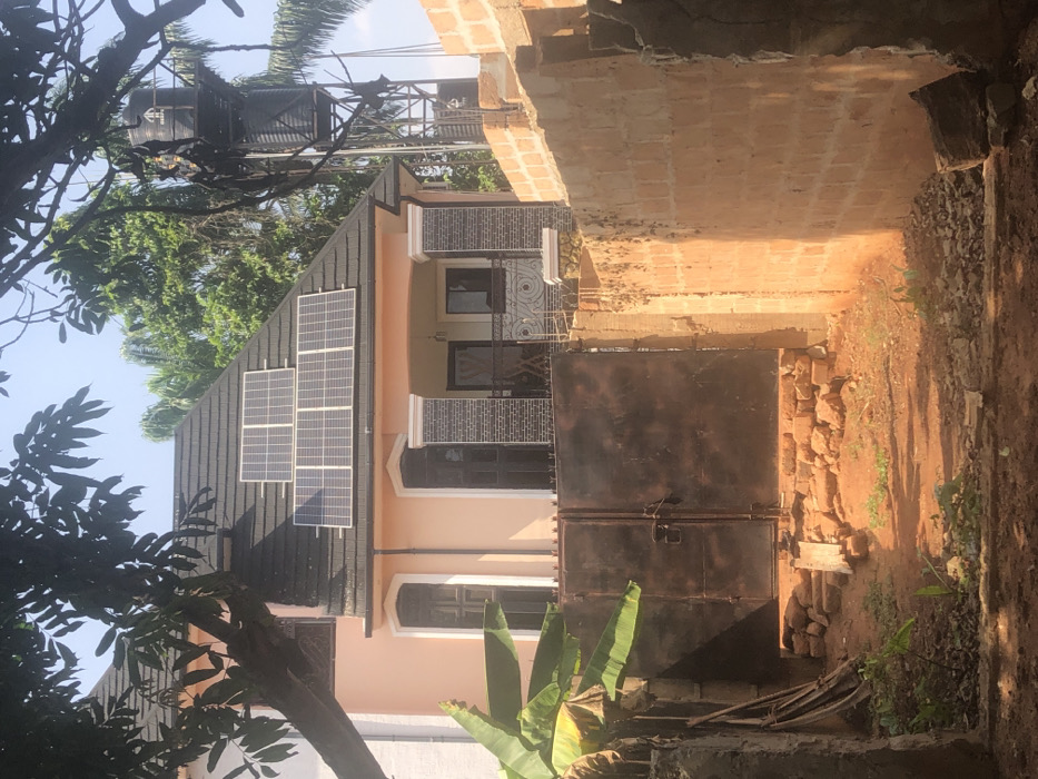The image depicts a peach-colored two-story residential building located in Ifitedunu, Nigeria, under a clear sky. The house features a dark, pitched roof equipped with six solar panels arranged in two arrays: one 2x2 and one 1x4. The front facade includes multiple arched windows/doors and a covered porch area with decorative white balusters and dark brick-veneered pillars. The property entrance is secured by a large, dark, rusted metal double gate. The ground in the foreground consists of reddish-brown soil with scattered bricks and debris, suggesting a somewhat unkempt or under-construction immediate exterior. Green foliage, including large banana leaves on the left and tree branches framing the top, surrounds the scene. In the background to the right of the house, a tall metal structure supports two black water tanks. Unfinished reddish-orange brick walls are visible along the right side of the foreground, bordering the property. No individuals are present, and no actions or interactions are depicted.