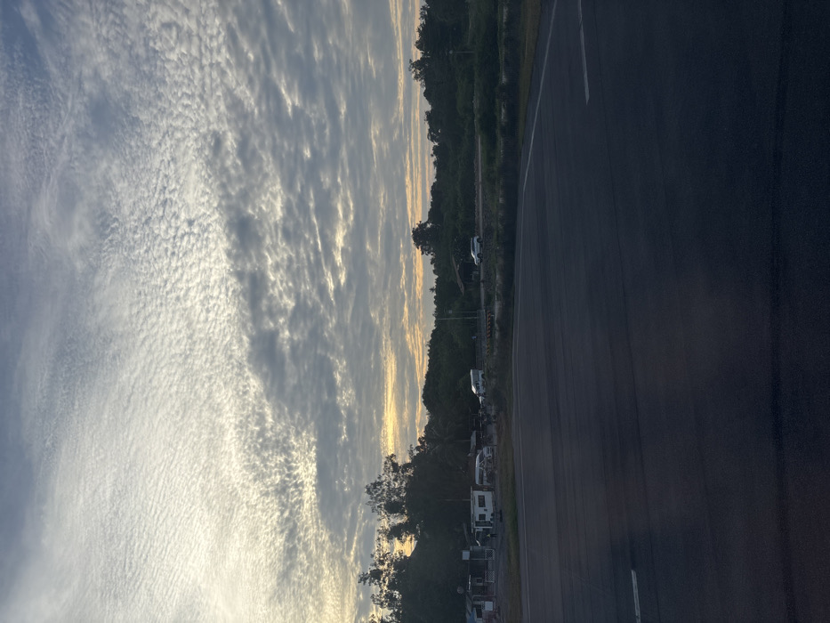 The image presents an outdoor scene at sunrise or sunset in Baan Bang Rak, Thailand, viewed across an asphalt surface, possibly an airport tarmac or taxiway. The upper half of the frame displays a sky filled with patterned altocumulus clouds, illuminated by a low sun angle that casts a warm, yellowish-orange glow along the horizon, most prominent on the left. The foreground consists of a dark grey, paved surface with subtle linear markings. In the midground, a linear arrangement of elements separates the foreground from the background. On the left, several small, utilitarian buildings with light-colored facades are visible, along with multiple parked vehicles, including at least two white vans. Further to the right, a white SUV is positioned on a road that appears to run parallel to the foreground. Vertical poles are intermittently placed along this midground strip. The background is composed of dense tropical foliage, primarily trees, silhouetted against the sky. A small, dark structure with a peaked roof is partially visible within the trees on the right side. No discernible individuals are present.