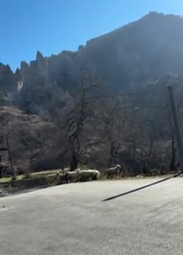 flock of sheep crossing a paved road, with a mountainous landscape in the background. The sky is clear and blue. The trees are bare. A child can be heard calling "Mama."
