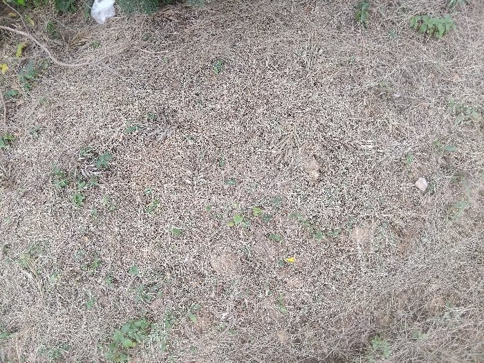A landscape primarily covered in dry, matted grass and sparse vegetation. The grass is a uniform beige tone, contrasting with patches of green sprouts scattered throughout. A few small rocks and bare earth patches are visible. In the upper left corner, some green shrubbery and a white plastic bag are present, adding slight variation to the otherwise monochrome ground cover. The composition gives an impression of untamed, possibly neglected, terrain.