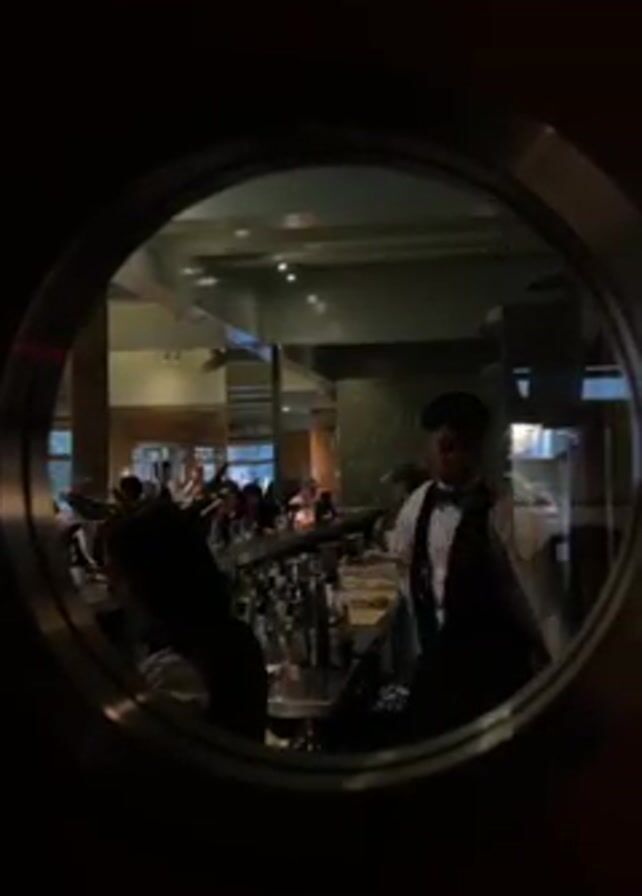 busy restaurant scene through a round window, likely a porthole-style opening. Inside, people are seated at a long bar. Bartenders, wearing white shirts and black aprons, are working behind the bar, preparing drinks. The bar is stocked with bottles and glassware. Servers in white shirts and aprons walk about. The interior lighting is dim. Some people are having conversations, while others are focused on the bar. The view is somewhat obscured by the window, with a dark foreground and the bright, bustling interior visible through the circular opening.