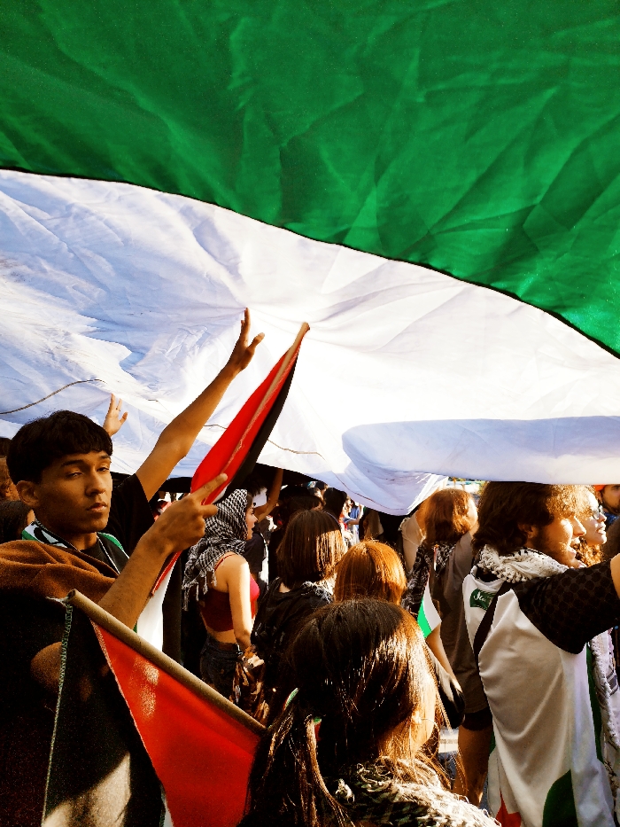 - "A group of people are carrying a very large flag, presumably the Palestinian flag, which is green, white and black" by FM-ZqBmD2, licensed under CC BY 4.0