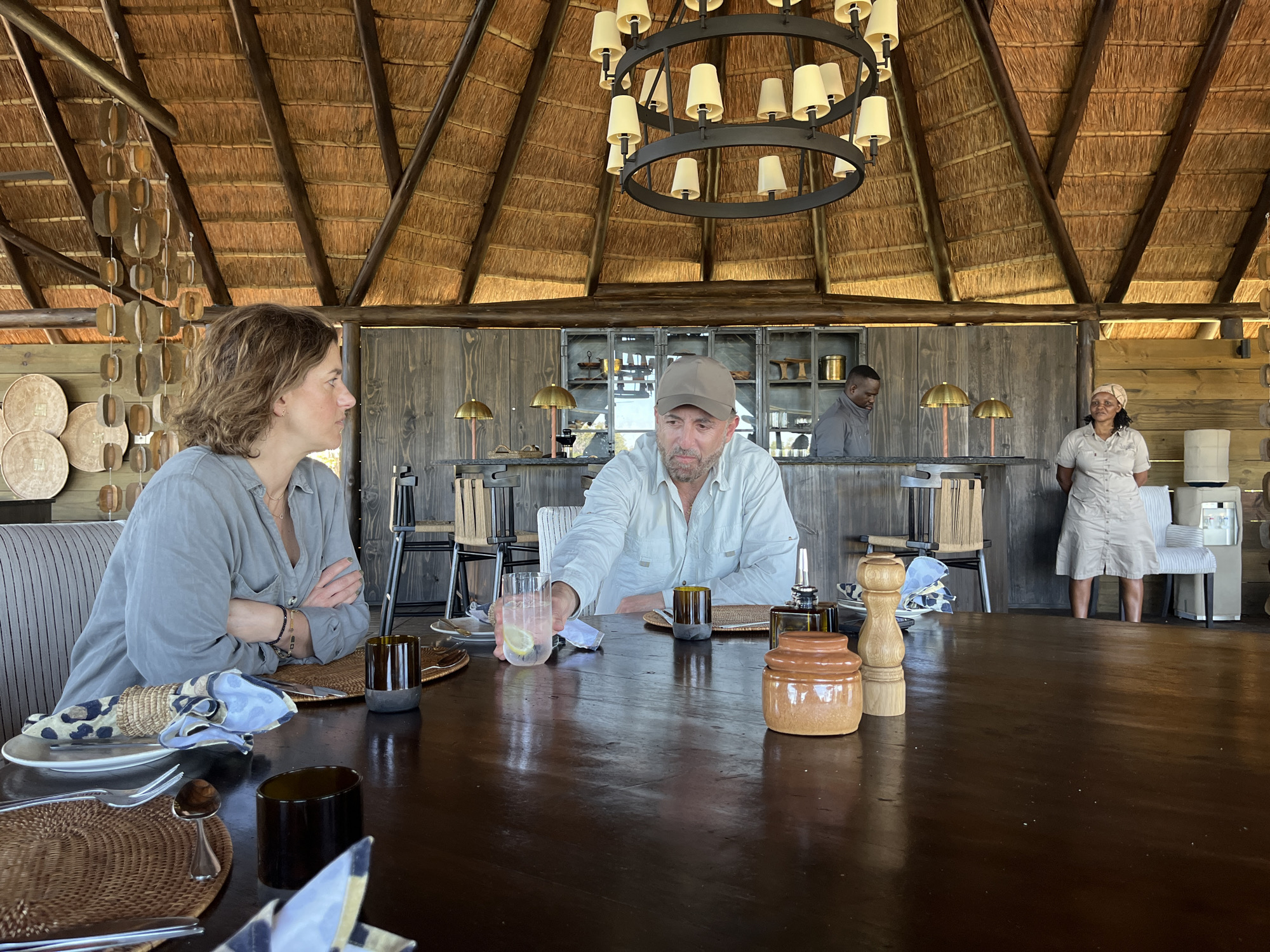 two people seated at a large wooden table in what appears to be a restaurant or dining area in Khwai, Botswana. The woman on the left is wearing a gray shirt and has her arms crossed. The man on the right is wearing a light-colored shirt and a baseball cap, and he's holding a glass of liquid with a lemon slice. The table is set for dining with plates, silverware, woven placemats, and napkins. A salt and pepper grinder and a ceramic jar are also on the table. Behind them, there's a bar area with two men in uniform working. A woman in uniform stands near a chair and some storage cabinets. The building has a thatched roof and wooden walls. A chandelier hangs from the roof above the table. Decorative woven items are visible on the wall to the left.