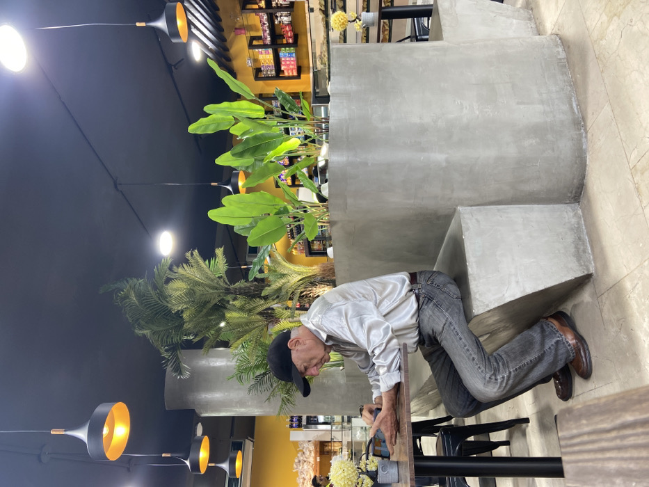 An indoor commercial establishment in Maturin, Venezuela, features a modern design with a black ceiling and light-colored tiled floor. An adult male, appearing to be in his late 50s or early 60s, is seated in profile on a light grey concrete bench at a dark-colored table. He wears a black baseball cap, a shiny light grey long-sleeved shirt, dark grey jeans, and brown leather shoes. His hands are positioned over a small dark electronic device on the table, which also holds a small grey pot containing artificial yellow and white flowers. The seating area is integrated with large light grey concrete planters containing tall artificial palm trees and broad-leafed green plants. The ceiling is equipped with multiple black pendant lights featuring warm orange interior shades and additional recessed lighting. In the background on the left, a yellow wall is visible behind a display counter and shelves; a blurry figure in a white shirt is partially visible behind this counter. The background on the right shows dark shelves stocked with various packaged goods.