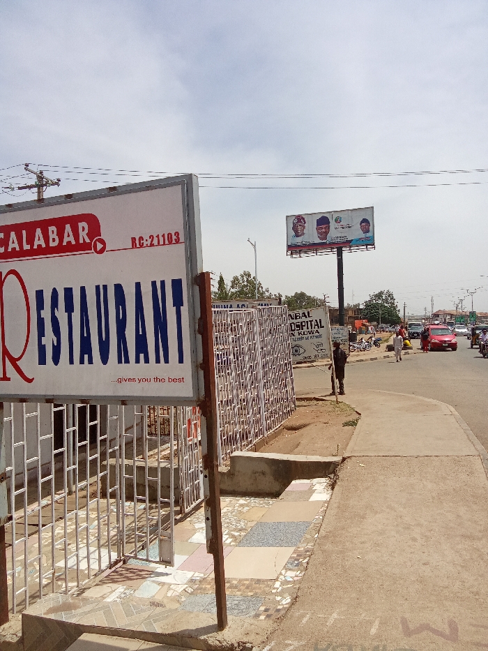 This image depicts a daytime urban street scene in Jos, Nigeria. The view is angled from a slightly low perspective, looking down a commercial thoroughfare under a sky with scattered white clouds. In the immediate foreground, a rectangular white sign is prominently displayed, supported by two rusty brown metal poles. The sign reads "CALABAR RESTAURANT." "CALABAR" is in red capital letters with a small red play button-like icon to its left, and "RC: 21103" in red is positioned above the 'R' in CALABAR. "RESTAURANT" is in large blue capital letters below, with "...gives you the best" in smaller blue text underneath. Behind and to the left of this sign, a white metal security gate with a rectangular grid pattern encloses an area. The ground directly in front of this gate and beneath the sign is covered with a multi-colored tiled pavement, featuring shades of grey, beige, and light blue. To the right, a patch of reddish-brown dirt abuts a raised concrete sidewalk that runs parallel to the street. In the midground, a tall, thin individual in dark clothing stands on the dirt patch/sidewalk, holding a long, slender object, facing towards the street. Partially obscured behind this individual and the gate, another sign is visible, displaying "JINBAL HOSPITAL" and "IN KOWA EYE CENTRE" with an eye graphic. The asphalt road, occupying the right side of the frame, carries vehicular traffic including a red sedan positioned in the right lane and multiple motorcycles further down the street. Pedestrians are observed walking on the sidewalk and near the road. Further down the street on the right, a large billboard on a tall dark pole features portraits of three male political figures. Overhead power lines are visible, strung between utility poles on the left. The background consists of low-rise buildings and green trees lining the street, which appears to curve gently to the right in the distance. Based on the visible "JINBAL HOSPITAL" signage, the specific location is a commercial street in Jos, Nigeria, consistent with areas around Bauchi Road in Jos North.