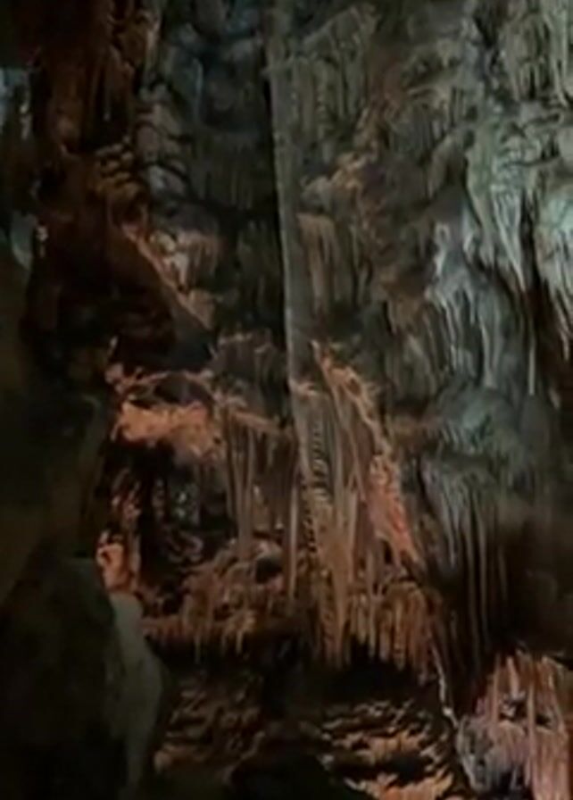 inside of a cavern. The cavern walls are covered in formations of rock, mostly stalactites. The rock is a dark gray color, with some parts appearing brown. The lighting is dim and uneven, highlighting the textures of the formations. The camera is stationary.