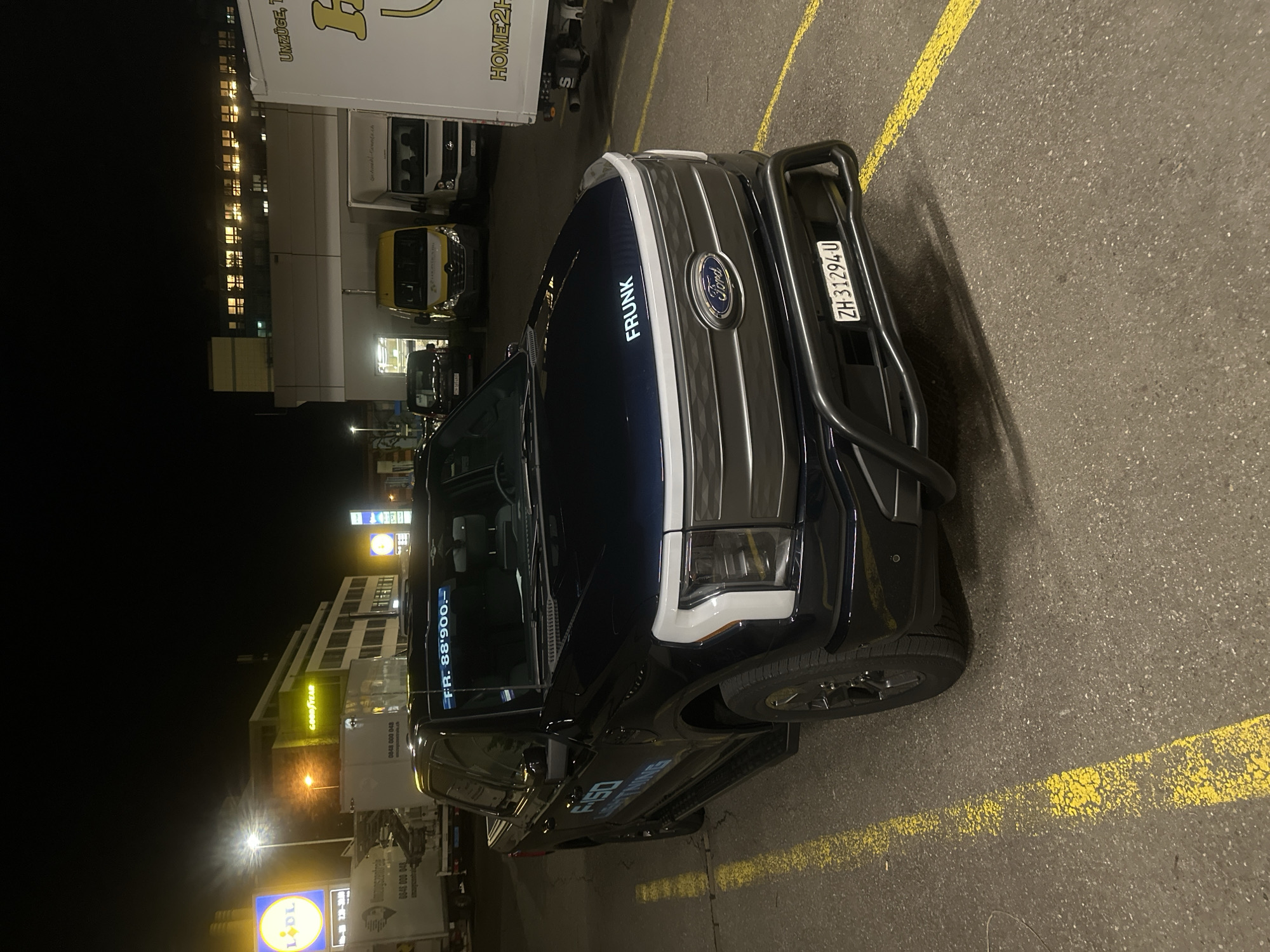 A dark blue Ford F-150 Lightning electric pickup truck is centrally parked at night in an asphalt parking lot with yellow markings in Volketswil, Switzerland