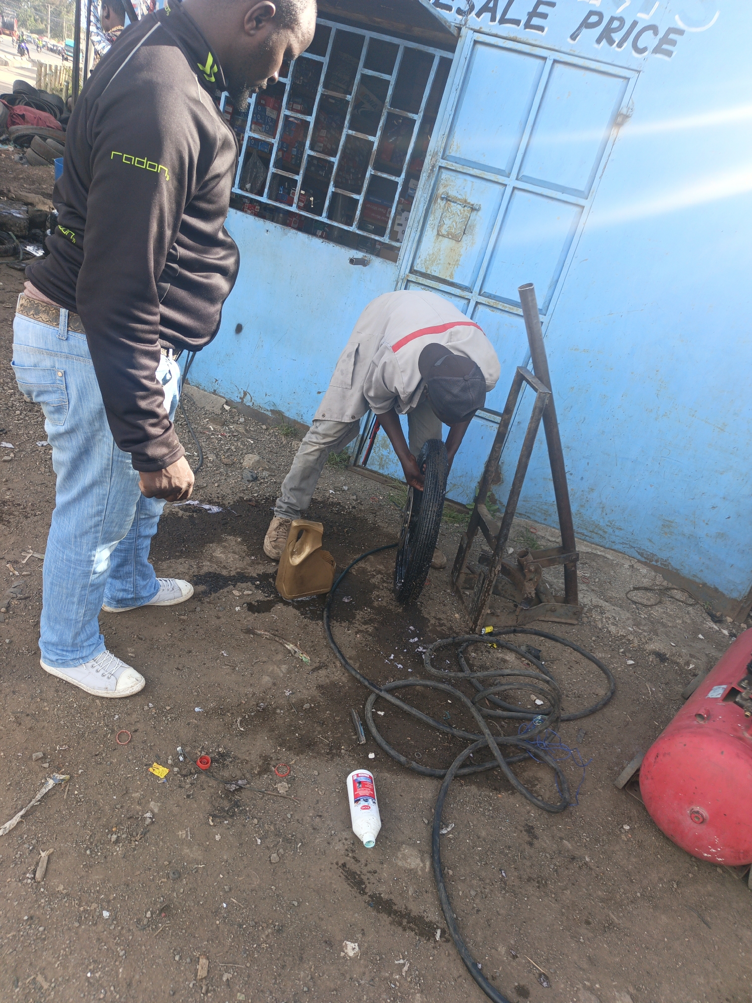 two men working on a tire in what appears to be a small, informal roadside repair shop. The location is likely in Nairobi, Kenya. One man, wearing a black jacket with the word "radon" on the sleeve and light blue jeans, is standing and observing. He is dark-skinned, with a beard, and is looking down at the activity. The second man is bending over, working on a tire that is mounted on a metal stand. He is wearing a light grey shirt with a red stripe on the back, grey pants, and a black baseball cap. He appears to be in the process of repairing or replacing the tire. The backdrop is a light blue building with a sign that reads "SALE PRICE". The ground is dirt, scattered with tools, a discarded oil container, plastic pieces, and a bottle of tire sealant. A red air compressor and tangled black air hoses are visible in the foreground.