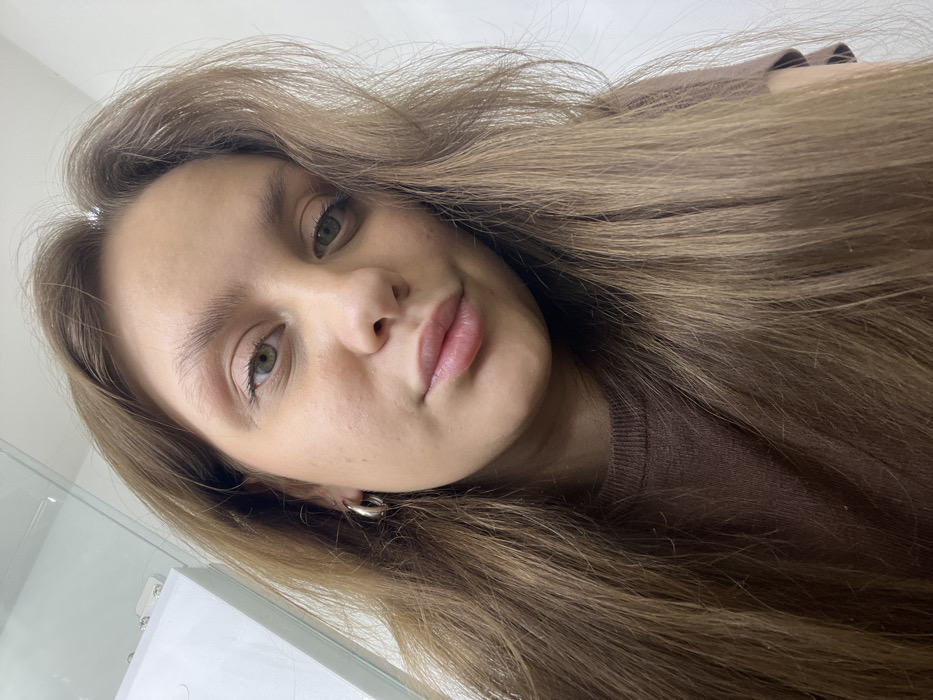 A close-up portrait shows a female subject with light brown, long hair, light skin, and green eyes, directly facing the camera with a neutral expression and slightly parted lips