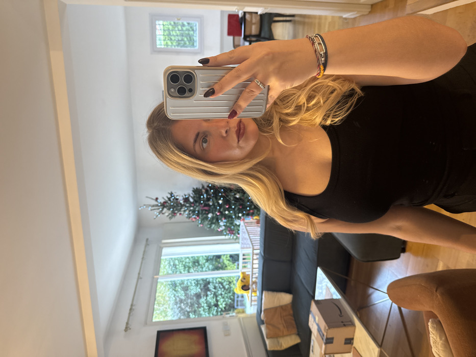 The image depicts a woman taking a mirror selfie in a residential interior located in Rueil-Malmaison, France. The woman, with long blonde hair, fair complexion, and dark red lipstick, wears a black ribbed tank top. Her right hand, featuring dark red painted nails and a silver ring on the ring finger, holds a light grey smartphone with a multi-lens camera system. Her left wrist displays a stack of bracelets, including a multi-strand leather or cord bracelet with a metallic clasp and a beaded bracelet. The reflection in the mirror reveals a living room and dining area. In the living room section on the left, a dark grey sectional sofa with two beige and brown pillows is situated. An open Amazon cardboard box rests on a light-colored coffee table. A brown upholstered armchair is partially visible in the reflection's lower left. A large glass door or window overlooks a garden with dense green foliage, where a yellow toy, possibly a character figure, is visible behind a white fence. Centrally positioned in the reflection is a decorated Christmas tree adorned with lights and ornaments. To the right, a dining area features a dark table and chairs, with a dark red object placed on the table. A window with a white grid pattern is visible on the far right wall. The interior features white walls and light-colored wooden flooring.