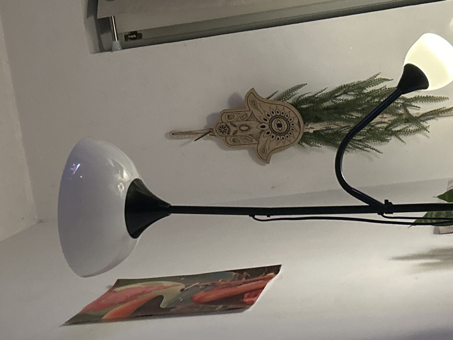 - "A black and white lamp stands out against a white wall, alongside a brown hamsa-shaped object surrounded by green foliage" by FM-aYYtj2, licensed under CC BY 4.0