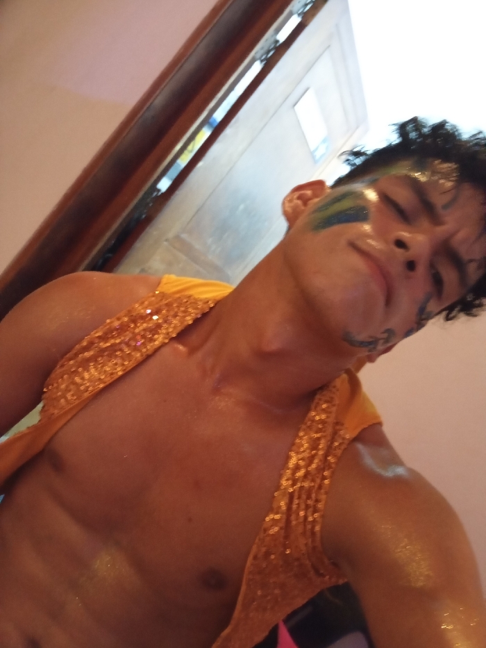 A man with curly hair and blue and yellow face paint gazes downward. He wears an open, shimmering gold vest. His chest and shoulder appear sweaty or glistening. The background includes a slightly ajar door, revealing a light-filled space. The image is taken from a low angle.