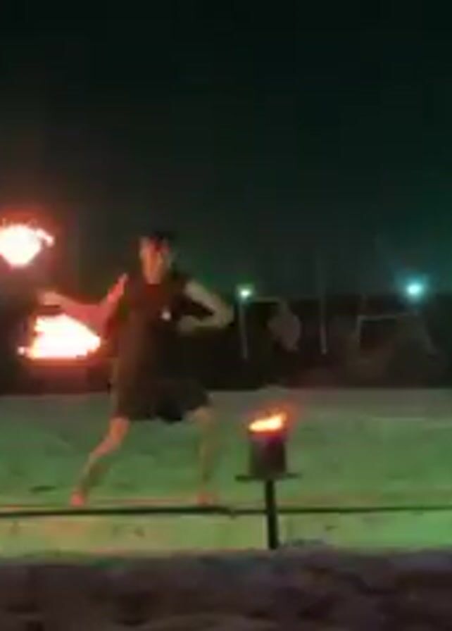 A man is performing fire dancing on a beach at night. He's wearing a black tank top and shorts and is barefoot. He juggles two flaming torches, tossing them in the air and twirling them around his body. A small cauldron with flames sits to his right. In the background, large illuminated letters spell out "NARANJA" in green lights. There are a few other people standing around, watching. The beach is sandy, and the scene is lit by red and green lights.