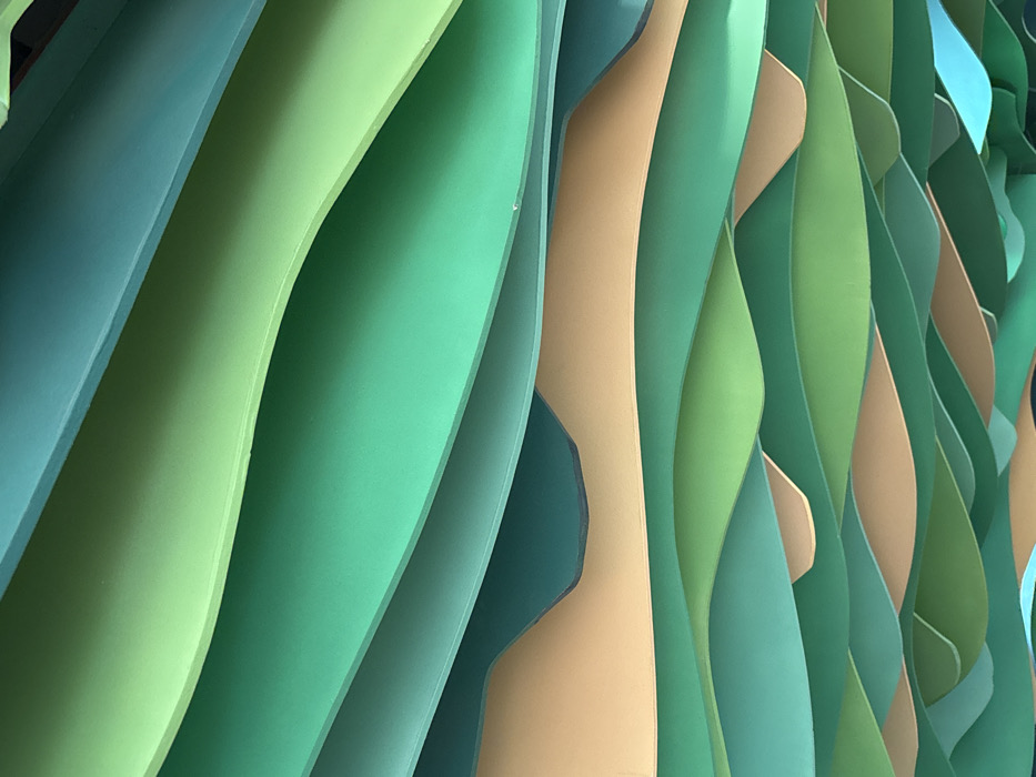 The image captures an overhead architectural installation in Naucalpan de Juárez, Mexico. The scene consists of numerous layered, undulating panels creating a wave-like or contoured ceiling structure. The panels are presented in a palette of varying green hues, including light green, medium green, dark green, and teal, interspersed with sections of beige. The layering and curves generate depth and cast subtle shadows. No individuals, specific objects other than the panels, or observable actions are present within the frame. The environment is an interior space, characterized by consistent, diffuse illumination.