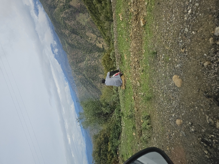 A wide shot depicts a mountainous landscape under an overcast sky, observed from a low vantage point, partially obscured by a vehicle's side mirror in the bottom left. In the middle ground, a lone male figure is seated facing away from the viewer on a low, light-colored object on a patch of green grass. He wears a light-colored long-sleeved garment and dark trousers; a red and white object is positioned near his right side. The immediate foreground consists of a gravelly and stony unpaved surface with sparse green vegetation. The background is dominated by multiple layers of undulating mountains covered in dense green foliage, extending into the distance under a cloudy sky. Distant white structures are visible along the mountain slopes. Several parallel power lines are visible traversing the upper sky. The scene is located in the city of Moqrisset, Morocco.