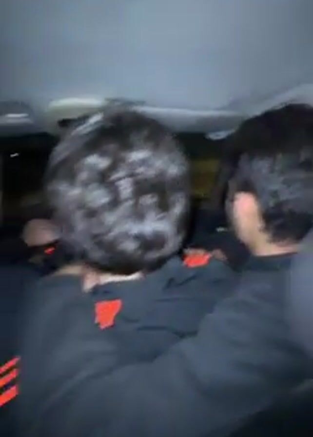 The interior of a car at night is shown from the back seat, where three people are sitting. Two people, presumably the driver and passenger, are seated in the front, and their backs are to the camera. The two people in the front seats are wearing black hoodies with orange stripes on the back. The camera swivels to show three young men in the back seat. The first man has dark hair, glasses, and a mustache. He is wearing a black shirt. The next man is wearing a light gray shirt. The last man in the back seat is mostly out of frame. There are streetlights visible outside the car window.