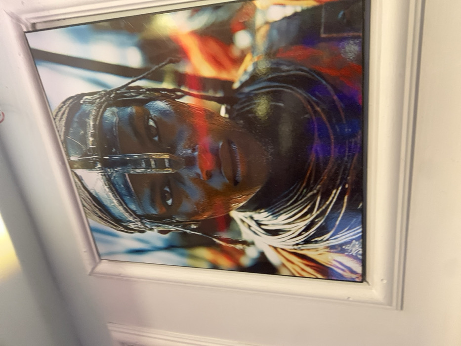 A framed portrait hangs on a white wall. The artwork features a person with dark skin and braided hair, adorned with a reflective visor-like accessory. Their expression is serious and contemplative. The background blends vibrant reds, oranges, blues, and whites in an abstract manner. The photograph has a glossy finish, with some reflections visible on its surface. The frame is simple and white, matching the wall's color.