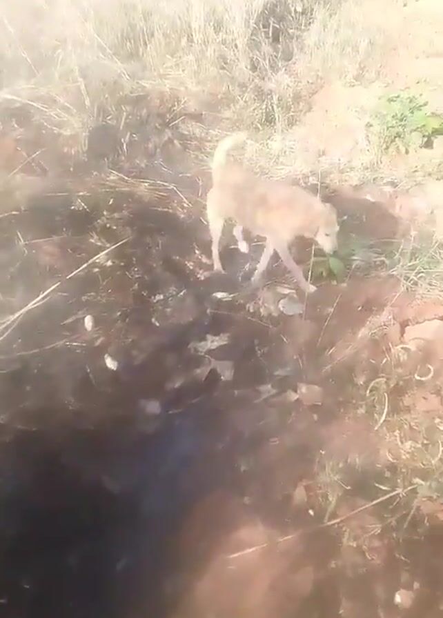 light-colored dog standing near a muddy pit outdoors. There is dry grass and dirt surrounding the pit. Someone is speaking and mentions “fighting.” The dog appears to be looking down into the pit.