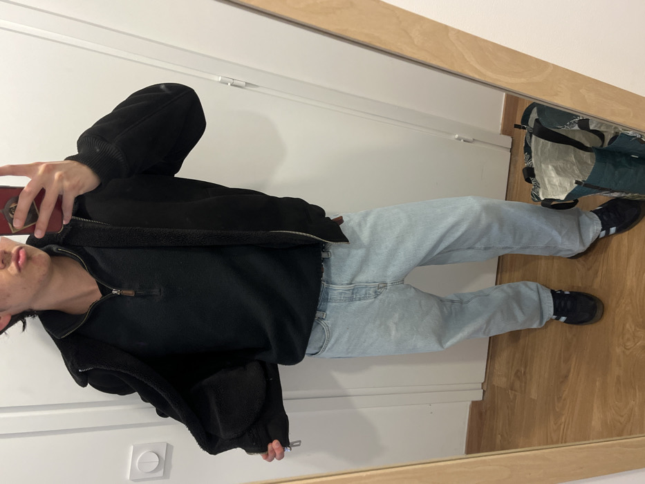 The image displays an individual, appearing male, taking a mirror selfie inside what appears to be a residential interior in Villeneuve-d'Ascq, France. The subject is visible from the upper chest to the feet, with dark hair and pursed lips. The right hand (viewer's left) holds a smartphone with a reddish-brown case to capture the reflection. The left hand (viewer's right) holds open a black jacket, revealing its dark, likely fleece or sherpa lining. A dark, possibly black, quarter-zip sweater is worn underneath the jacket. The subject wears light-wash blue jeans with a button fly and dark-colored sneakers featuring white stripes or accents. The environment includes white walls and a light-colored wooden floor. A white electrical outlet or switch plate is present on the wall behind the subject. A light wooden framed mirror reflects the scene, and a dark green reusable shopping bag with a light-colored, patterned interior rests on the floor to the subject's right (viewer's left).