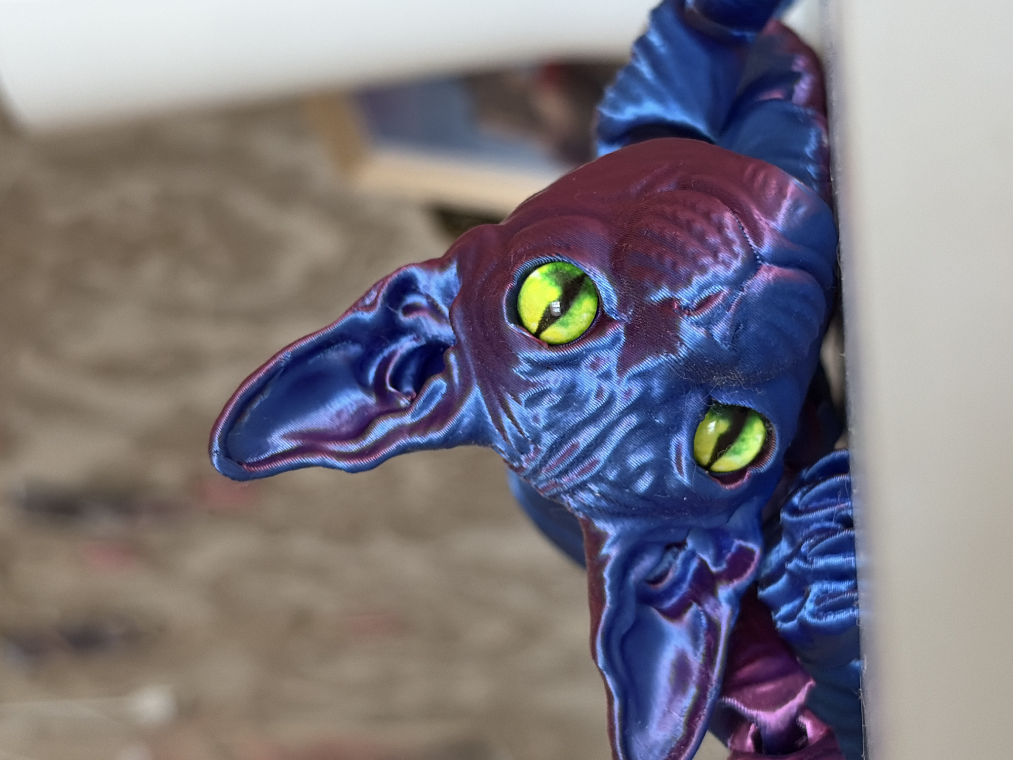 The image presents a close-up, low-angle view of a 3D-printed figurine, depicting a stylized creature resembling a Sphinx cat, resting on a flat, light-colored surface. The figurine's surface exhibits an iridescent, color-shifting finish, predominantly displaying deep blue and magenta hues, with visible print lines consistent with fused deposition modeling. Its eyes are a vivid yellow-green, featuring prominent black vertical pupils. The background is rendered out of focus, revealing a textured, brownish-grey wall or wallpaper in the upper left. To the right, a blurred vertical white element is present, behind which indistinct blue and white forms suggest a distant object or a framed image. No individuals are depicted, and no active interactions are occurring. The scene is situated in Izhevsk, Russia.