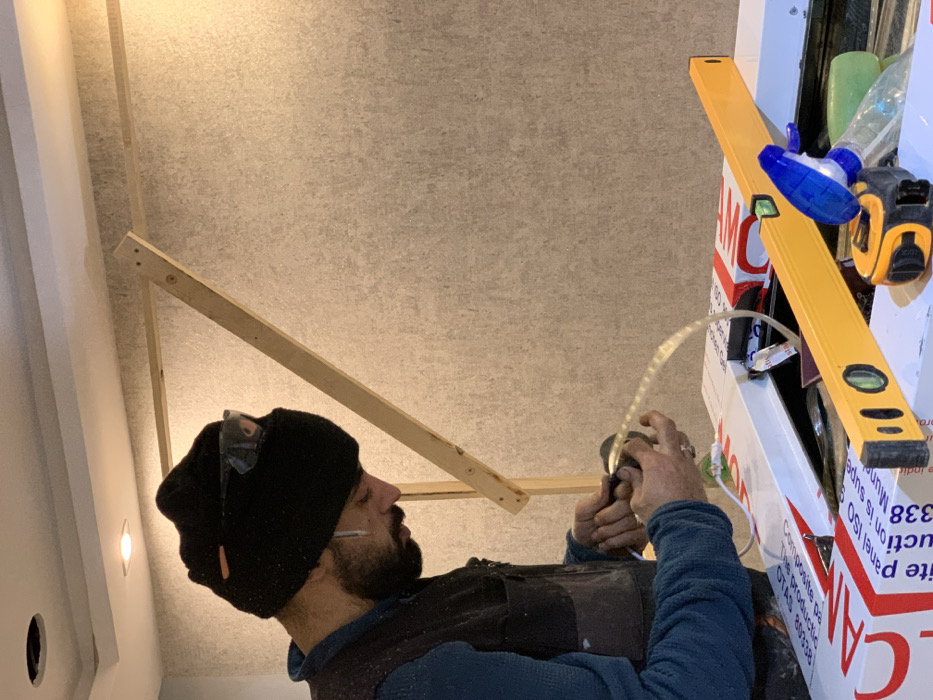 An indoor scene in Ouislane, Morocco, depicts a male individual focused on electrical or installation work. The man, seen from the chest up in profile, wears a black beanie with clear safety glasses resting on it, a blue long-sleeved shirt, and a dark vest. He has a dark beard and is holding a strip of LED lighting, appearing to manipulate its wiring or connections with both hands. In the foreground, resting on a white box labeled with visible text including "CANAPEL ISO 80038" and "composite panel," are a yellow spirit level, a black and orange tape measure, and a blue spray bottle. The background consists of a light-colored, textured wall and a partially constructed wooden frame structure made of light-colored planks. A white ceiling with a recessed light fixture is visible in the upper left, with another light source casting a warm glow on the wall.