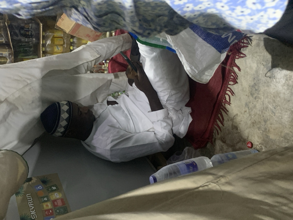 A man wearing a navy and white patterned kufi is lying on his side, dressed in white robes. He appears to be using a phone, with a red rug and white sacks behind him. The scene is somewhat confined, with various objects like water bottles, a Skyrun box, and grocery items scattered around. A blue patterned cloth is draped above, creating a sense of being enclosed or in a makeshift space.