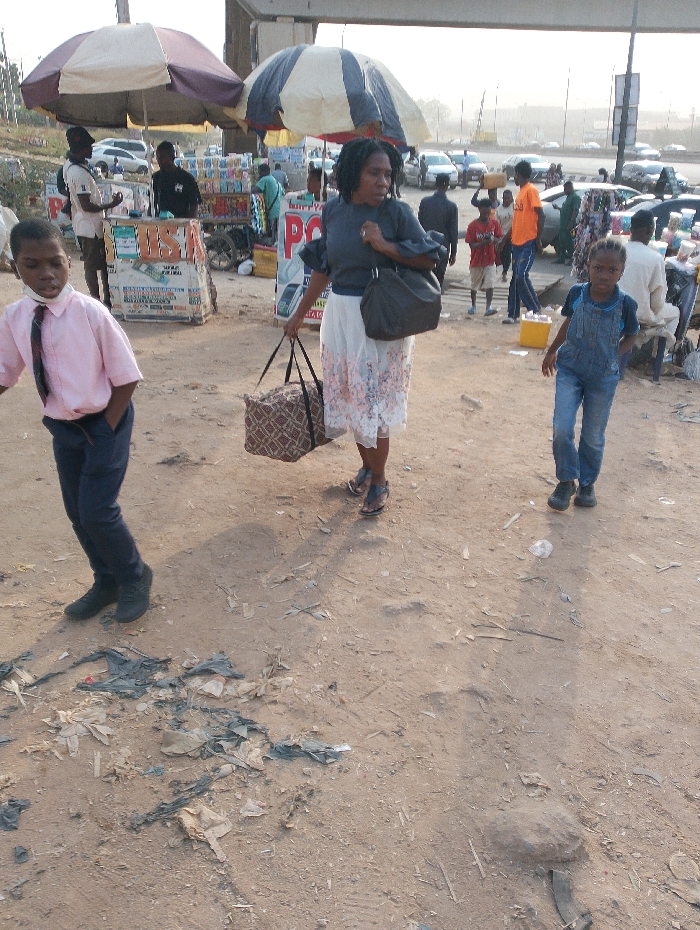 This image depicts a bustling outdoor scene in Kagini, Nigeria, under an elevated road or bridge structure. The ground is unpaved, dusty, and littered with various debris, including torn plastic bags and wrappers. In the foreground, three individuals are walking. On the left, a boy in a light pink collared shirt, dark tie, dark trousers, and dark shoes walks with his left hand in his pocket. In the center, a woman with dark hair wears a dark grey blouse with ruffled sleeves, a white floral-patterned skirt, and dark shoes. She carries a dark shoulder bag on her left shoulder and a patterned brown and black duffel bag in her right hand. To the right, a younger girl in blue denim overalls, a light blue t-shirt, and dark shoes walks forward. In the midground, two vending stalls are set up. The left stall is covered by a cream and maroon umbrella, displaying various goods. A man in a light shirt and dark cap stands behind it. The right stall is covered by a cream and dark striped umbrella, featuring a large red sign with partial lettering "POPPY" visible. The background shows a busy area with numerous vehicles, primarily cars, parked or moving, suggesting a road or market. Pedestrians are also visible in the distance. A large concrete overpass spans the upper portion of the frame. The overall atmosphere appears hazy or dusty.