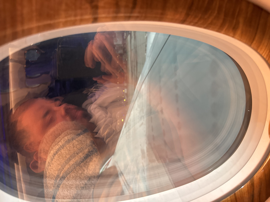 An oval window with a light wood frame encases a blurred scene. The reflection shows a person sleeping, holding a mobile phone. Outside, a blurred airplane wing is visible. The lighting is warm, possibly from the cabin lights, casting a reddish hue on the sleeping figure. The overall image is distorted due to movement and reflection in the window.