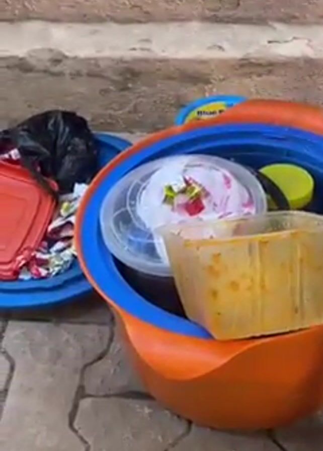 A person wearing pink flip-flops is preparing food outdoors. They are opening a small red packet near a colorful bucket filled with various containers. Next to the bucket is a black trash bag in a blue pan. The camera pans to show two large metal pots sitting on top of small, charcoal-burning stoves, set on a tiled patio near a wall. The larger pot has a lid on top. There is a black bag near the stove and a smaller, lidded pot to the side.