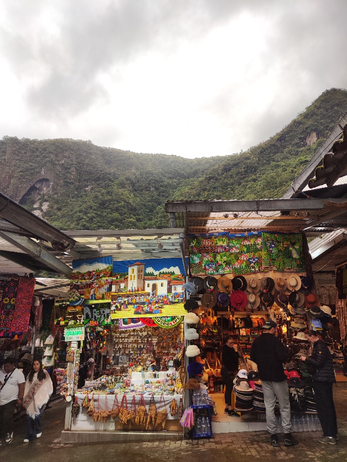 A vibrant marketplace is set against a backdrop of lush, green mountains under a cloudy sky. Stalls are laden with colorful textiles, hats, and various souvenirs. People are browsing and shopping. The scene exudes a busy, touristy atmosphere with a blend of nature and commerce. The structures have tin roofs with market goods inside.