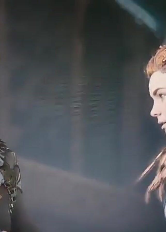 The scene features two characters facing each other: a male and a female. The male character is dressed in tribal attire, including a headdress and ornate chest covering. He has dark hair and facial features. The female character has reddish-brown hair styled in braids or waves. She wears a more practical outfit with a vest or harness. They appear to be engaged in a serious conversation or interaction. The background is slightly blurred and indistinct.