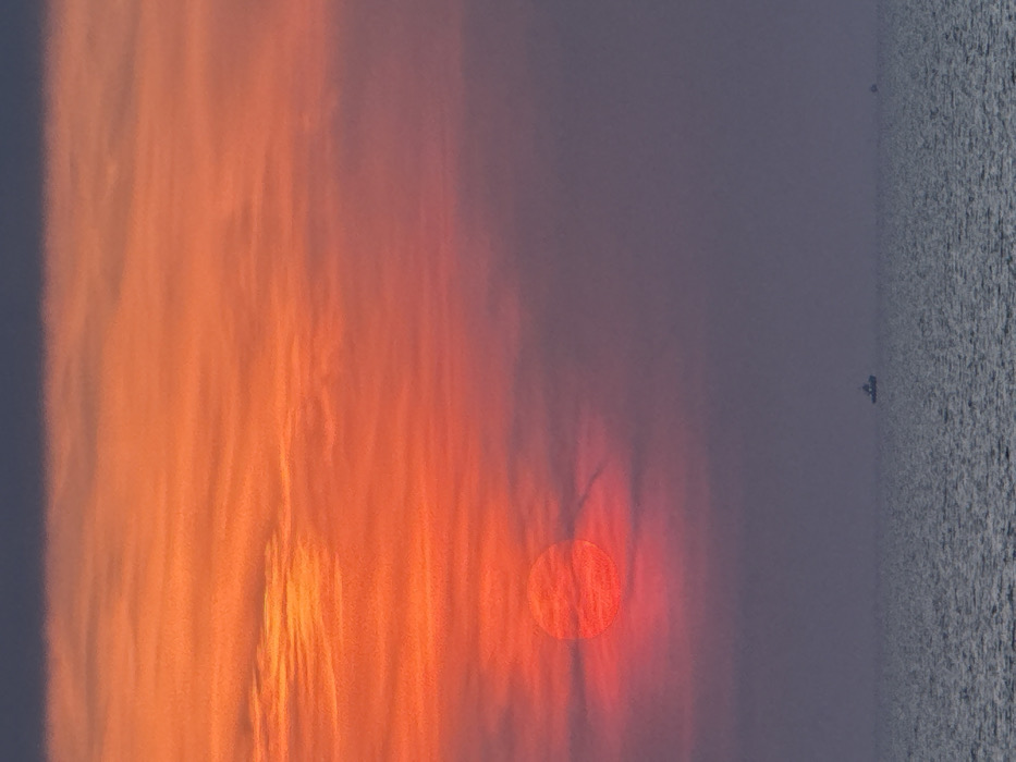 This image depicts a coastal scene in Alexandroupolis, Greece, during sunset or sunrise. The sky dominates the upper two-thirds of the frame, exhibiting a gradient of colors from deep orange and red in the central and upper-left portions to cooler purple and indigo tones along the top and right edges. Streaky, translucent clouds are present, particularly dense around a prominent, circular, deep red-orange solar disc positioned in the upper-left quadrant, which appears partially obscured. The lower third of the image shows a body of water, likely the Aegean Sea, displaying a textured surface with subtle ripples and a muted grey-blue coloration. A distinct horizon line separates the sky and water. Two small, dark, indistinct vessels are visible on the horizon: one centrally positioned but slightly to the left, and another, smaller, less defined object further to the right. The overall atmosphere appears hazy, contributing to the diffused light and the indistinct outlines of the distant vessels. No individuals are discernible in the scene.