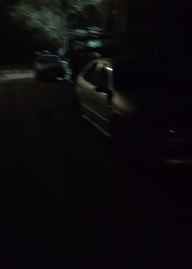 very dark outdoor night scene. Initially, there is a glimpse of two parked cars under a streetlight in a narrow road or driveway lined with trees and buildings. Then the camera rapidly moves to point upwards, revealing what appears to be the moon visible through clouds. The quality of the video is poor due to the darkness and shaky movement.