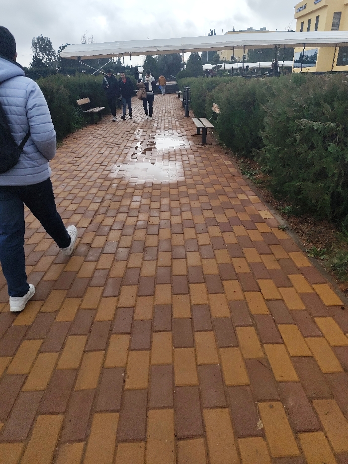 The image captures an outdoor paved pathway in Jibb as-Safa, Syria, under an overcast sky. In the foreground, the lower back and legs of an individual are visible, wearing a light blue puffer jacket, dark pants, and white sneakers, with a black backpack, moving towards the right side of the frame. The pathway consists of rectangular pavers laid in an alternating pattern of brown and yellowish-brown bricks. A large puddle reflecting the sky is present on the pathway in the midground. Four additional individuals are observed walking away from the camera further along the pathway. From left to right, these individuals are dressed in dark outerwear, a red top, a white scarf with a dark jacket while carrying a light-colored bag, and a light brown jacket respectively. The pathway is bordered on both sides by dense green bushes. Two wooden benches with dark metal supports are positioned along the pathway edges. In the background, a long, white fabric canopy extends horizontally, partially obscuring a multi-story, light-yellow building with numerous windows on the right, which bears a partial sign, possibly "UNIVERS," on its upper facade. Trees are visible in the distant background on the left.