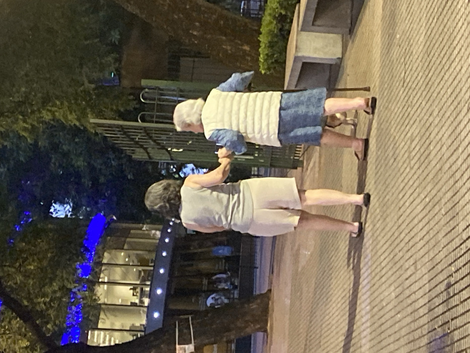 Two elderly women walk arm in arm on a paved surface. The woman in the foreground wears a sleeveless gray top and light shorts, while the other wears a light vest over a blue shirt and skirt. They both wear black shoes. A metal fence is visible between them. The background includes trees, a building with blue lights, and street lighting. The image has a slightly rotated perspective.