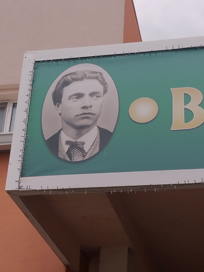 An upward-angled photograph captures a large, rectangular outdoor sign mounted on a building facade. The sign features a teal-green background. On the left side, an oval, light-colored frame encloses a monochrome portrait of a young man. He has styled, parted hair, and is depicted wearing a dark jacket, a light-colored vest, a white collared shirt, and a dark, patterned tie. His gaze is directed slightly towards the viewer's left. To the right of the portrait, a solid, light-colored circle is followed by a large, stylized letter "B" in the same light color. The sign is secured within a white frame by multiple small, white fasteners visible along its top and left edges. A string of small white lights is affixed to the underside of the sign's frame. The building behind and below the sign has an orange-peach colored facade. A white-framed window with multiple panes is partially visible on the upper left side of the building. The sky above is uniformly light grey and overcast. No active individuals, actions, or interactions are present in the scene. The location is an unspecified street or commercial area within the city of Unknown, Unknown.