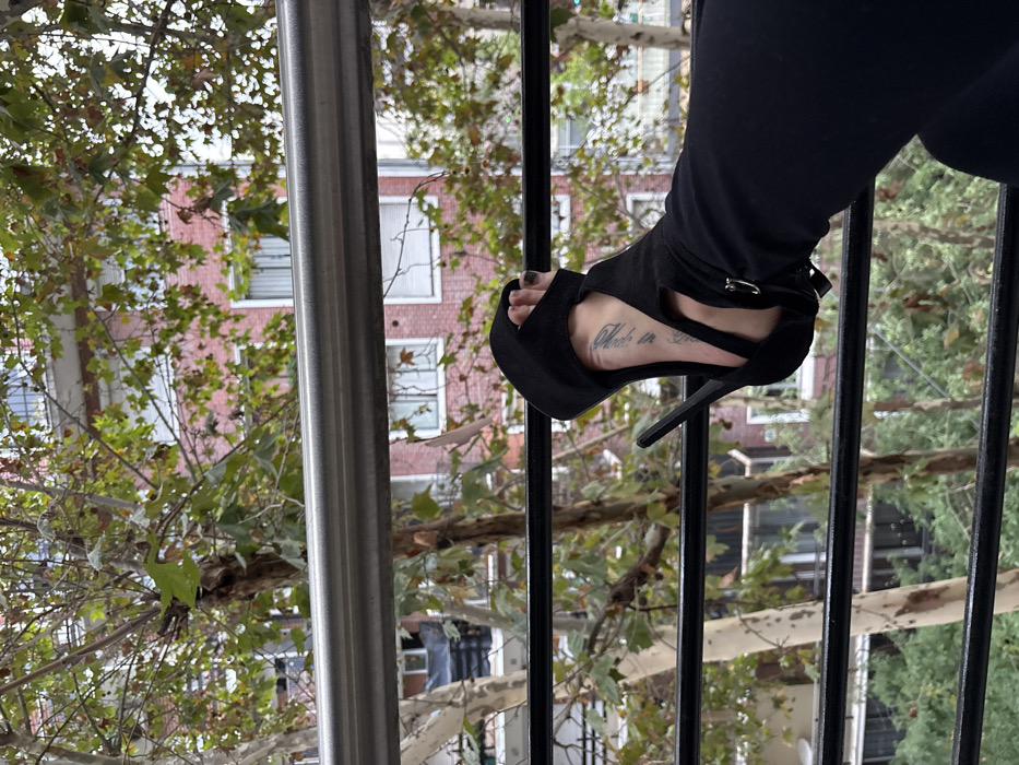 A partial view of a human leg, clad in black pants and a black high-heeled, open-toe platform shoe, extends from the lower right toward the center