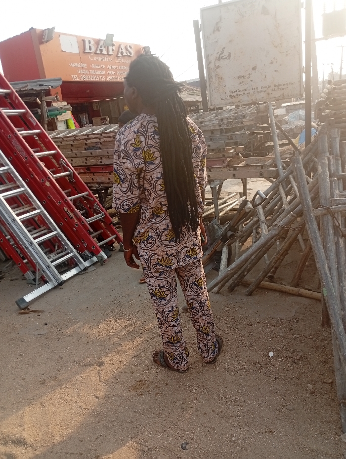 An individual is depicted standing on an unpaved, sandy-gravel surface in a commercial area of Lokoja, Nigeria. The person is viewed from the back, featuring long, dark dreadlocks extending down their spine. They are wearing a two-piece patterned garment, consisting of a long-sleeved top and trousers, adorned with a light-colored background and intricate yellow, blue, and brown floral/foliage designs. Dark sandals are worn on their feet. To the left of the individual, multiple aluminum extension ladders, predominantly red and silver, are stacked and leaned against an unseen structure. Behind these ladders, an orange-colored building with a prominent sign reading "BAFAS" is visible. Below "BAFAS," additional text identifies it as a "Cosmetics Store" and lists services such as "SKINCARE," "MAKE UP," "BEAUTY FACIAL," "FACIAL TREATMENT," and "BODY PROGRAM," along with two Nigerian phone numbers: "08030201575" and "08059196...". To the right of the individual, a large quantity of metal scaffolding components, including poles, frames, and cross-braces, are loosely stacked on the ground. Behind these materials, a large, rectangular, blank or heavily weathered billboard structure, supported by metal posts, stands against the bright sky. The scene is illuminated by strong natural daylight, casting subtle shadows.